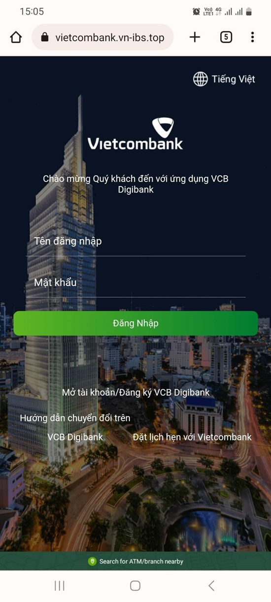 Hình ảnh Giao diện trang web của đường link lạ giống hệt với ứng dụng Digibank của ngân hàng Vietcombank