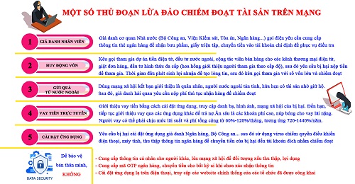 - Tội phạm lừa đảo chiếm đoạt tài sản: Các đối tượng bằng nhiều thủ đoạn giả danh nhân viên cơ quan pháp luật, tư vấn viên để thu thập thông tin cá nhân; đóng giả người nước ngoài gửi tiền về nước yêu cầu đóng phí hải quan; kêu gọi tham gia dự án nước ngoài, tiền điện tử, cộng tác viên bán hàng yêu cầu chuyển tiền để tham gia; giả mạo kêu gọi ủng hộ từ thiện; cài đặt ứng dụng vay tiền trực tuyến để cho vay lãi nặng hoặc đánh cắp thông tin cá nhân, truy cập trái phép vào tài khoản ngân hàng để chiếm đoạt tài sản. Theo pháp luật hiện hành, mức xử phạt đối với các đối tượng lừa đảo chiếm đoạt tài sản lên tới 20 năm tù hoặc chung thân.