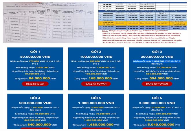 - Hợp đồng hợp tác hai bên ký kết theo mẫu soạn sẵn nhưng không ghi rõ chủ đầu tư, thời hạn đầu tư, phương thức quản lý vốn, phân chia lợi nhuận. Về bản chất hợp đồng này giống với hợp đồng ủy thác, trong đó, nhà đầu tư góp vốn qua các gói đầu tư để Công ty kinh doanh và trả lãi theo định kỳ. Trong hợp đồng thường có điều khoản quy định: “Hợp đồng sẽ chấm dứt trong trường hợp công ty giải thể hoặc tuyên bố phá sản”. Như vậy, nhà đầu tư có nguy cơ không thu hồi đủ số tiền đã đầu tư, thậm chí mất trắng nếu công ty dùng thủ đoạn giải thể, phá sản để trốn tránh nghĩa vụ trả nợ.