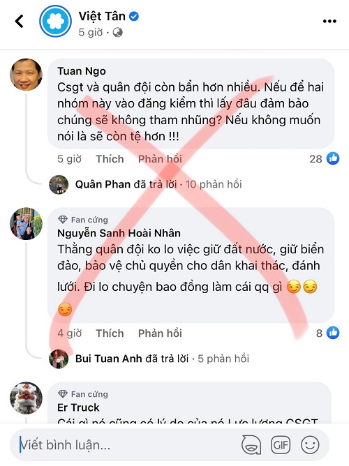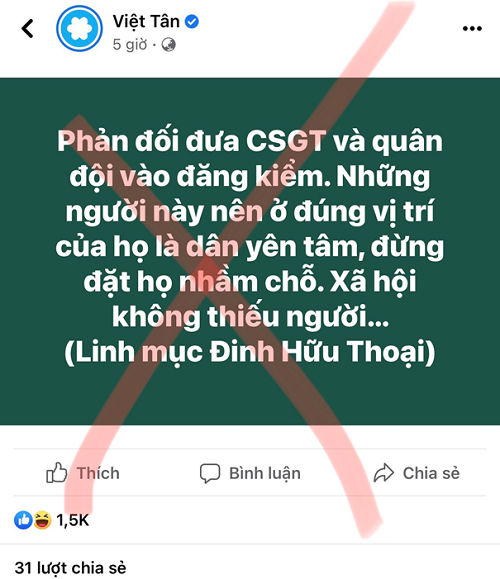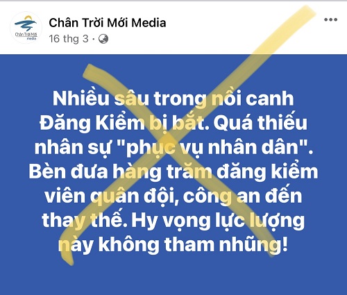 Tuy nhiên, trên một số trang mạng xã hội như “Việt Tân”, “Chân trời mới Media”, “RFA – Đài Á Châu tự do”… cùng nhiều tài khoản Facebook cá nhân đã có những bài viết, thông tin xuyên tạc, chống đối việc tiến hành giải pháp trên của Bộ Giao thông vận tải, với các luận điệu như: “Phản đối đưa Cảnh sát giao thông và quân đội vào đăng kiểm”, “Đăng kiểm – Điếm căng,…tận thu đến tận xương tủy và làm khó người dân bao năm nay”,…cùng với đó là rất nhiều chia sẻ, bình luận ủng hộ các trang mạng có ý xuyên tạc, bôi nhọ, hạ uy tín của các lực lượng chức năng (ở đây là lực lượng đăng kiểm viên) của Bộ Quốc phòng, Bộ Công an, phủ nhận giá trị, tính cấp thiết đối với đề xuất giải pháp của Bộ Giao thông vận tải.
