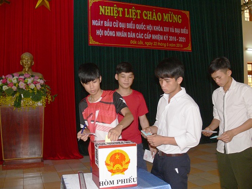 Học sinh đủ 18 tuổi trở lên ở 1 trường học ở tỉnh Đắk Lắk tham gia bỏ phiếu bầu Đại biểu Quốc hội khóa XIV và Đại biểu HĐND các cấp nhiệm kỳ 2016-2021