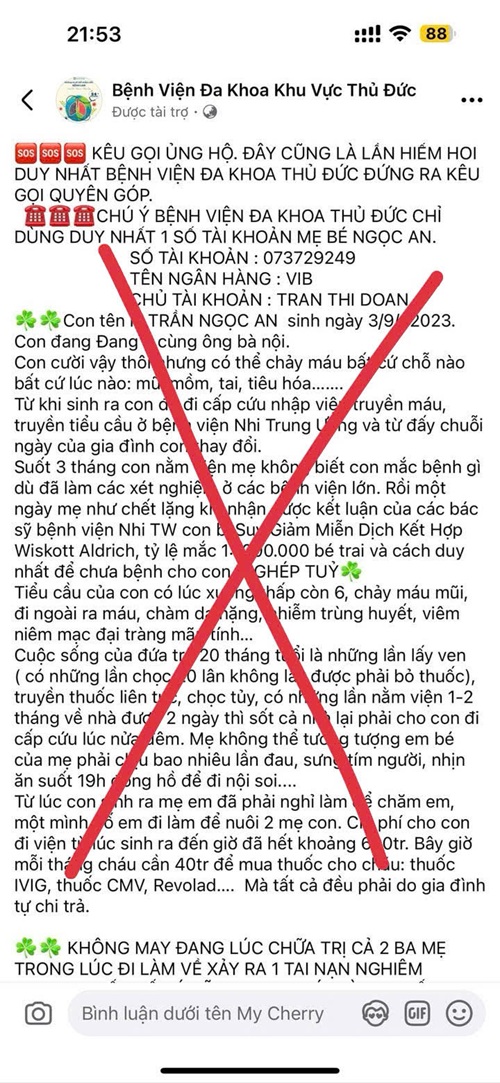 - Chỉ theo dõi và chuyển khoản ủng hộ qua các kênh chính thức của bệnh viện (có dấu tích xanh, đã xác minh).