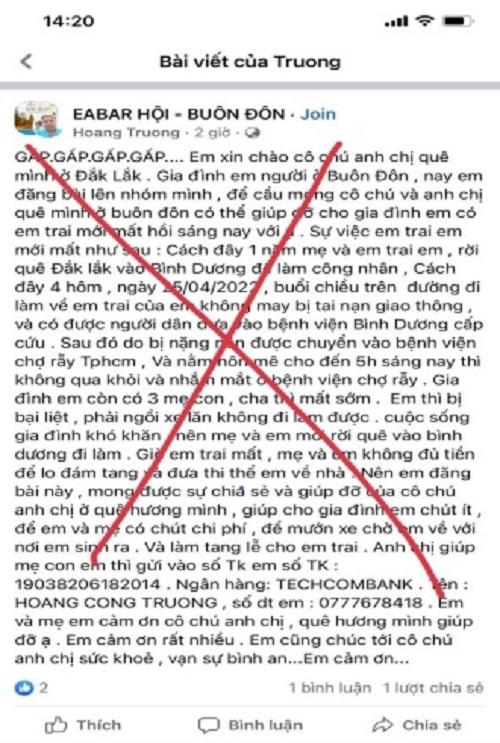 Như vậy, có thể khẳng định việc kêu gọi ủng hộ tiền để làm mai táng cho em trai đã tử vong như trong bài viết trên chính là thủ đoạn lừa đảo. Ở đây, đối tượng nhắm vào những người thiếu thông tin, kiến thức về địa danh, địa lý, kỹ năng nhận dạng, phân biệt đặc điểm giấy tờ, văn bản hành chính nhà nước nhưng có lòng trắc ẩn, tình thương người để trục lợi từ lòng tốt của họ. Mọi người cần nêu cao cảnh giác, tỉnh táo với thủ đoạn này, không chia sẻ bài viết, không chuyển tiền ủng hộ như lời kêu gọi trong bài viết trên để tránh bị lừa gạt./.