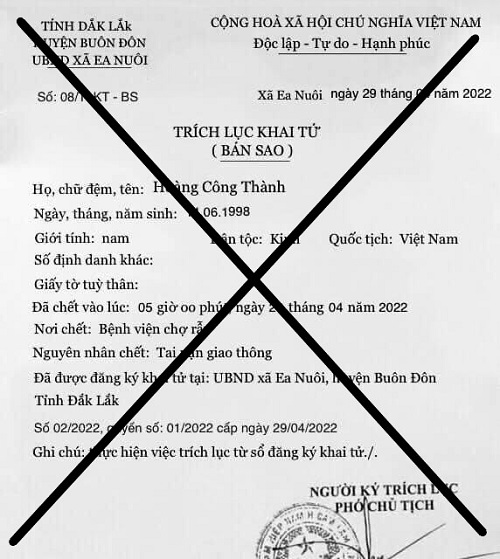 Ngày 29/4/2022, UBND xã Ea Nuôl cũng không cấp giấy trích lục khai tử công dân có tên Hoàng Công Thành như nói trên. Còn giấy trích lục khai tử đăng trong bài không phải của UBND xã Ea Nuôl.