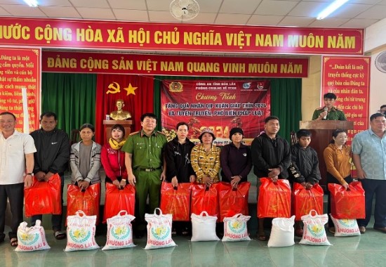 Phòng Cảnh sát QLHC về TTXH, Công an tỉnh Đắk Lắk thực hiện tuyên truyền pháp luật gắn với hoạt động thăm tặng quà cho bà con nhân dân trong dịp Tết Nguyên đán Giáp Thìn 2024 tại xã Ea Bar, huyện Buôn Đôn vào tháng 2/2024