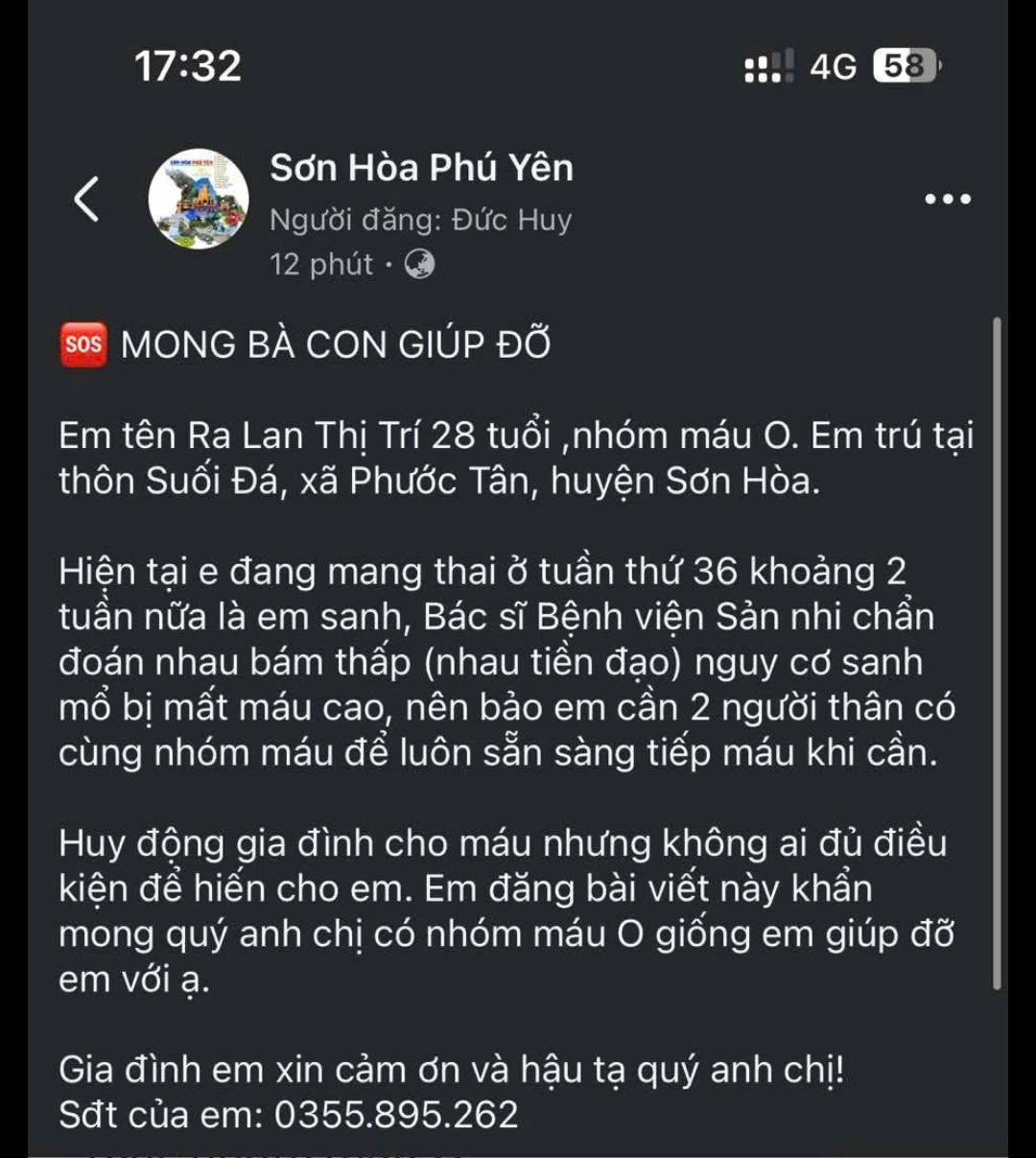 Khoảng 17h30’ chiều ngày 14/5/2025, qua thông tin trên trang Fanpage “Sơn Hòa Phú Yên” có chia sẻ đoạn tin của sản phụ Ra Lan Thị Trí (28 tuổi, trú tại thôn Suối Đá, xã Phước Tân, huyện Sơn Hòa) đang mang thai ở tuần thứ 36, khoản 38 tuần mới đúng thời gian sinh. Tuy nhiên qua khám tại Bệnh viện Sản nhi tỉnh Phú Yên, bác sỹ chuẩn đoán nhau bám thấp (nhau tiền đạo) nguy cơ sinh mổ bị mất máu cao phải cần có người thân cùng nhóm máu để hỗ trợ để bảo đảm an toàn cho mẹ và bé.Ảnh: Thông tin trên trang Fanpage “Sơn Hòa Phú Yên”.