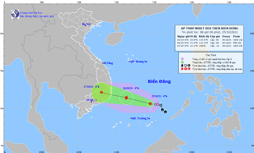 Theo dự báo của Trung tâm khí tượng thủy văn Quốc gia, hồi 01 giờ ngày 25/10/2021, vị trí tâm áp thấp nhiệt đới (ATNĐ) khoảng 10,5 độ Vĩ Bắc; 115,2 độ Kinh Đông, cách đảo Song Tử Tây khoảng 140Km về phía Đông Nam, sức gió mạnh nhất vùng gần tâm ATNĐ mạnh cấp 6 (40 – 50 km/giờ), giật cấp 8. Dự báo trong 24 giờ tới, ATNĐ di chuyển theo hướng Tây Tây Bắc, mỗi giờ đi được khoảng 15 kmvà có khả năng mạnh lên thành bão (bão số 9). Đến 01 giờ ngày 26/10, vị trí tâm bão vào khoảng 11,5 độ Vĩ Bắc; 111,9 độ Kinh Đông, trên vùng biển phía Tây Bắc quần đảo Trường Sa, sức gió mạnh nhất vùng gần tâm bão mạnh cấp 8 (60-70 km/giờ), giật cấp 10.