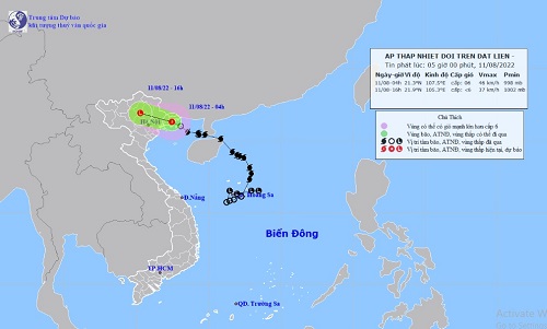 Vị trí và hướng di chuyển tiếp theo của áp thấp nhiệt đới suy yếu từ bão số 2 Mulan. (Ảnh: Trung tâm Dự báo KTTVQG)