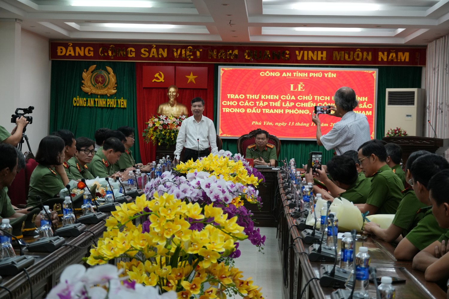 Sáng 13/11, Công an Phú Yên đã tổ chức Lễ công bố quyết định của Chủ tịch UBND tỉnh khen thưởng các tập thể thuộc Công an Phú Yên đã lập chiến công xuất sắc trong đấu tranh phòng, chống tội phạm, bảo đảm An ninh trật tự địa phương. Đồng chí Tạ Anh Tuấn, Phó bí thư Tỉnh ủy, Chủ tịch UBND tỉnh dự và trao thư khen cùng tiền thưởng 25 triệu đồng cho Văn phòng Cơ quan Cảnh sát điều tra (CSĐT), Phòng kỹ thuật nghiệp vụ - ngoại tuyến Công an tỉnh.