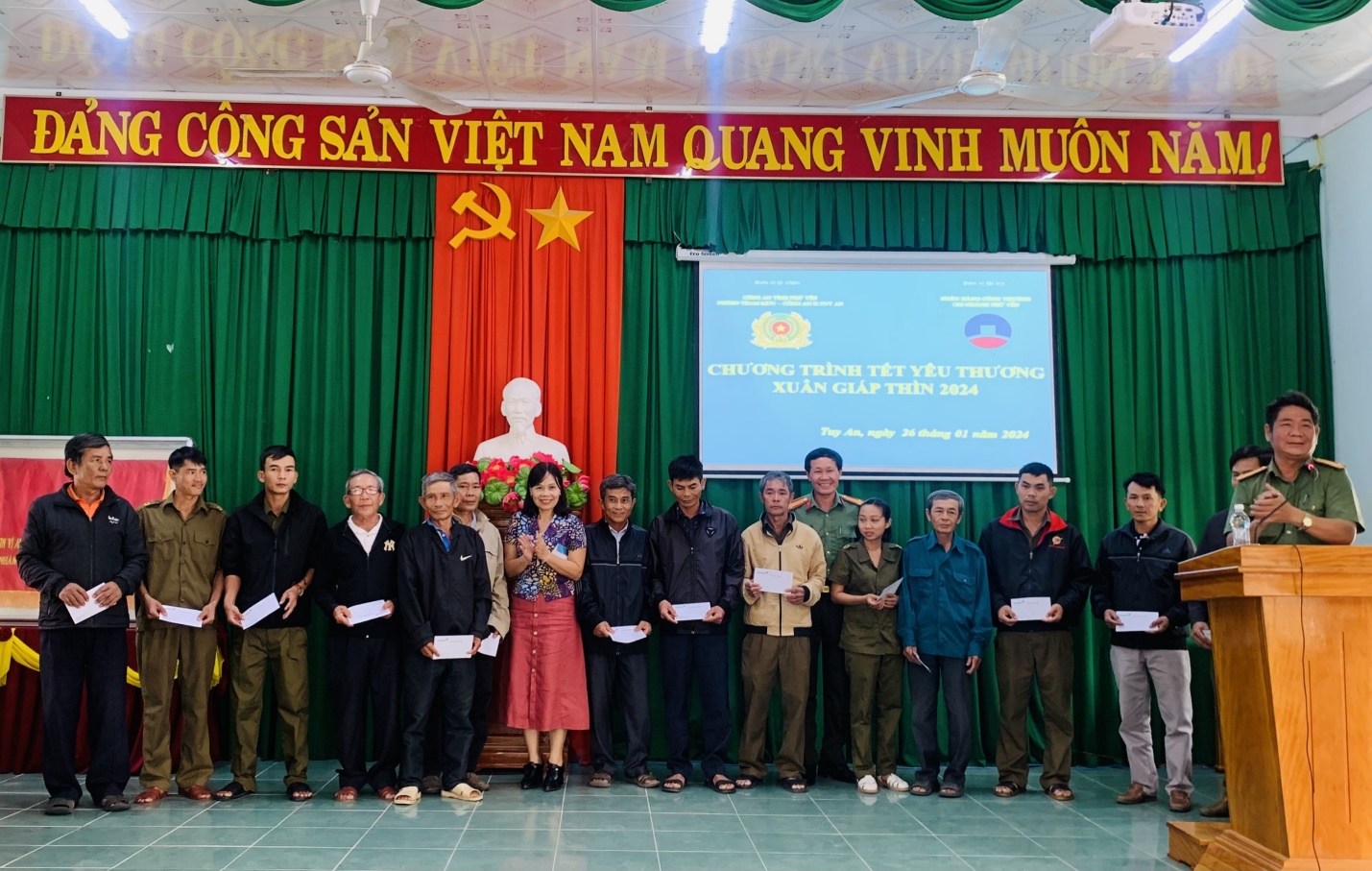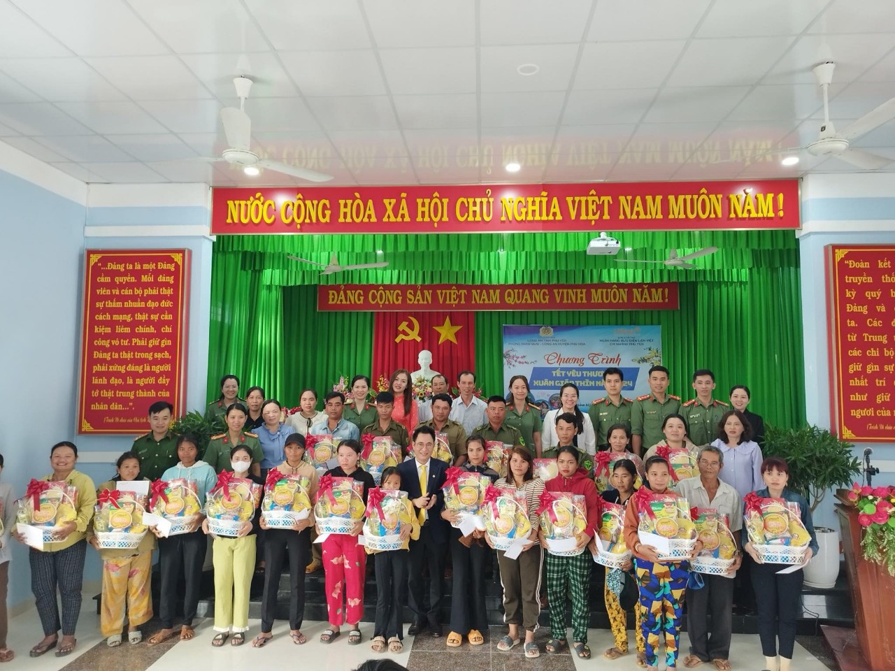 Nhằm phát huy tinh thần tương thân, tương ái, “lá lành đùm lá rách” nhân dịp Tết Nguyên đán Giáp Thìn 2024 và mở rộng mặt trận đoàn kết, tập hợp đoàn viên thanh niên, hội viên phụ nữ, tạo khí thế thi đua sôi nổi trong dịp thi đua lập thành tích chào mừng kỷ niệm 94 năm Ngày thành lập Đảng Cộng sản Việt Nam, mừng Đảng, mừng Xuân Giáp Thìn năm 2024. Ngày 26/01/2024, Chi đoàn, Hội Phụ nữ Phòng Tham mưu, Đoàn Thanh niên, Hội Phụ nữ Công an huyện Phú Hòa, Đoàn Thanh niên, Hội Phụ nữ Công an huyện Tuy An, Ngân hàng Bưu điện Liên Việt chi nhánh Phú Yên và Ngân hàng VietinBank chi nhánh Phú Yên đã phối hợp tổ chức Chương trình “Tết yêu thương - Xuân Giáp Thìn 2024” tặng 150 xuất quà, trị giá 75 triệu đồng nhân dịp Tết Nguyên đán Giáp Thìn 2024 tại huyện Phú Hòa và huyện Tuy An. Tại huyện Phú Hòa, Đoàn đã thăm, tặng 50 suất quà cho các hộ gia đình chính sách, hộ nghèo, các gia đình hoàn cảnh khó khăn và trao tặng 50 suất quà cho cán bộ, chiến sĩ lực lượng Công an xã bán chuyên trách có hoàn cảnh khó khăn hiện đang công tác tại huyện Phú Hòa, mỗi suất trị giá 500.000 đồng.