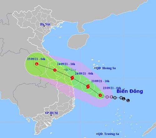 Theo Trung tâm dự báo khí tượng thủy văn Quốc gia: Hồi 07 giờ ngày 23/9/2021, vị trí tâm áp thấp nhiệt đới ở vào khoảng 13,5 độ Vĩ Bắc; 111,9 độ Kinh Đông, cách bờ biển Phú Yên khoảng 280km, cách bờ biển Bình Định khoảng 290km, cách bờ biển Đà Nẵng khoảng 500km. Dự báo trong 12 giờ tới, ATNĐ di chuyển chủ yếu theo hướng Tây Tây Bắc mỗi giờ đi được 15 – 20km và có khả năng mạnh lên thành bão. Trong 12 đến 24 giờ tiếp theo, bão di chuyển theo hướng Tây Tây Bắc, mỗi giờ đi được 15 – 20km, đi vào khu vực từ Thừa Thiên Huế đến Bình Định và suy yếu dần thành áp thấp nhiệt đới. Đến 07 giờ ngày 24/9, vị trí tâm áp thấp nhiệt đới ở khoảng 15,6 độ Vĩ Bắc; 108,3 độ Kinh Đông, trên khu vực từ Thừa Thiên Huế đến Quảng Ngãi. Sức gió mạnh nhất vùng gần tâm áp thấp nhiệt đới mạnh cấp 6 (40 – 50km/giờ), giật cấp 8.