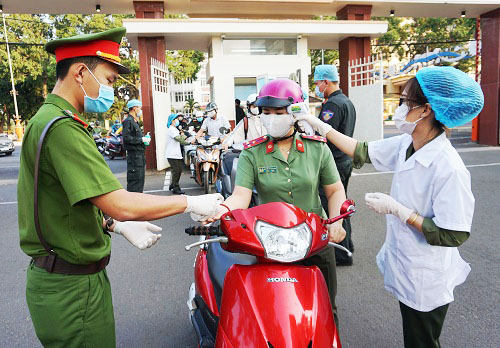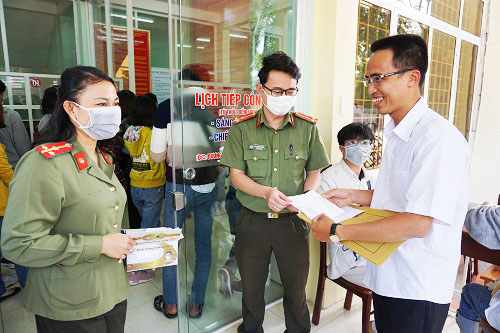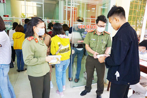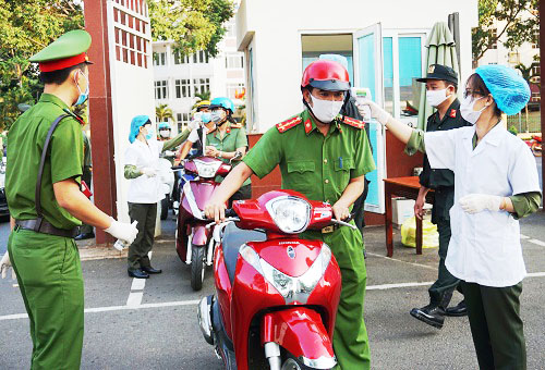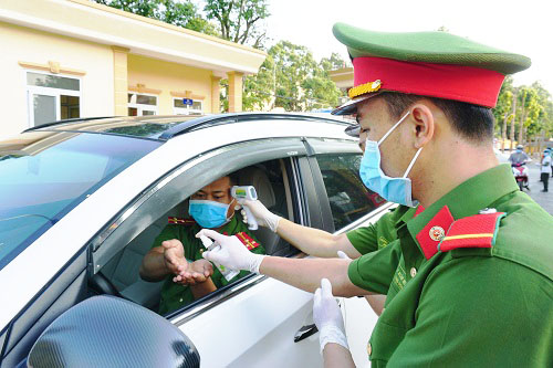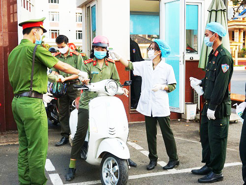 Kiểm tra thân nhiệt, vệ sinh sát khuẩn tay, nhắc nhở mọi người đeo khẩu trang y tế tại cổng Công an tỉnh