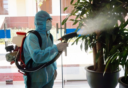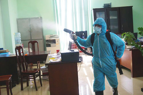 Phun thuốc tiêu độc, khử trùng tại các phòng làm việc thuộc Công an tỉnh và nơi giam giữ