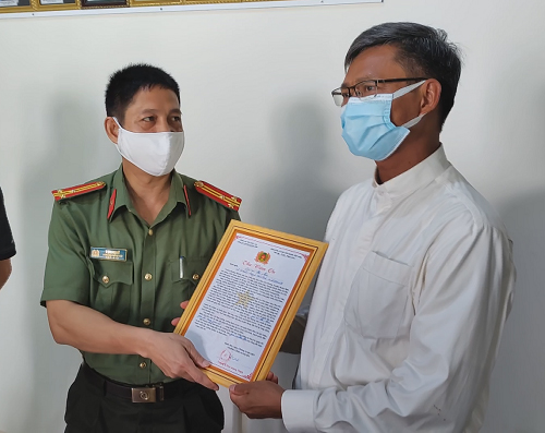 Thượng tá Y khoan Niê, Phó trưởng Công an huyện Buôn Đôn trao thư cảm ơn cho đại diện giáo xứ Hòa Nam