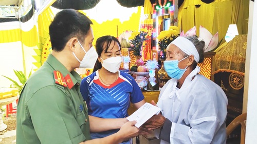 Đại diện Công an huyện Buôn Đôn trao tiền hỗ trợ, động viên cụ bà Phan Thị Thường vượt qua nỗi đau, sớm ổn định cuộc sống