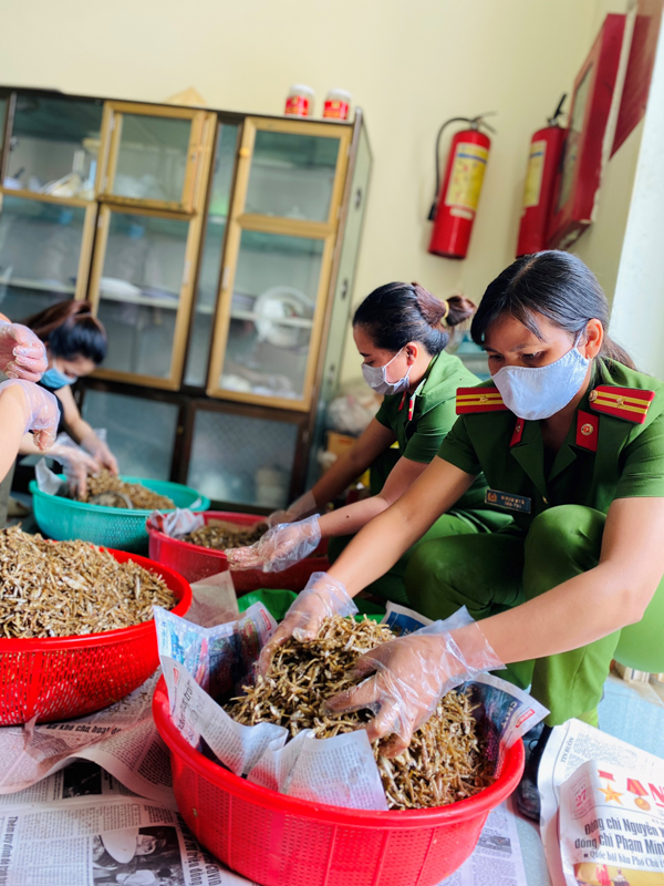 Hình ảnh cán bộ, chiến sĩ Công an huyện Buôn Đôn đang chế biến thực phẩm để gửi đến bà con trong khu cách ly
