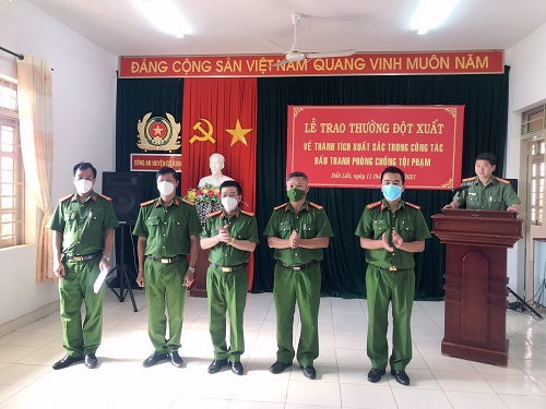 Đồng chí Đại tá Phạm Minh Thắng, Phó Giám đốc Công an tỉnh khen thưởng đột xuất cho Công an huyện trong công tác đấu tranh, phòng chống tội phạm