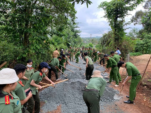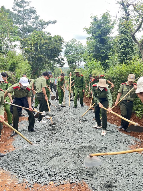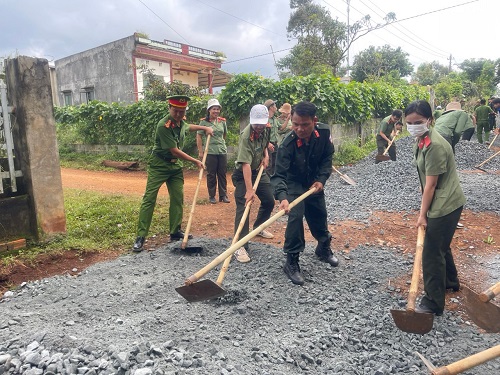 Đồng chí Thượng tá Nguyễn Cao Quyết, Trưởng Công an huyện cùng cán bộ, chiến sĩ cải tạo, nâng cấp đường đi lại cho Nhân dân