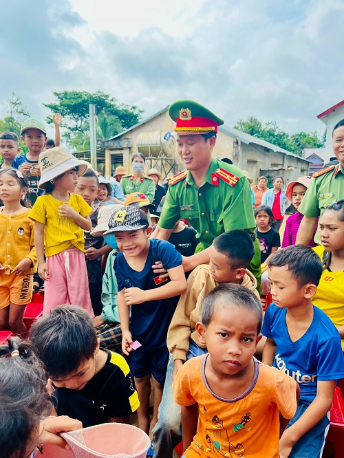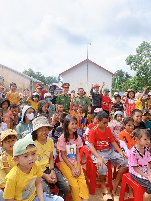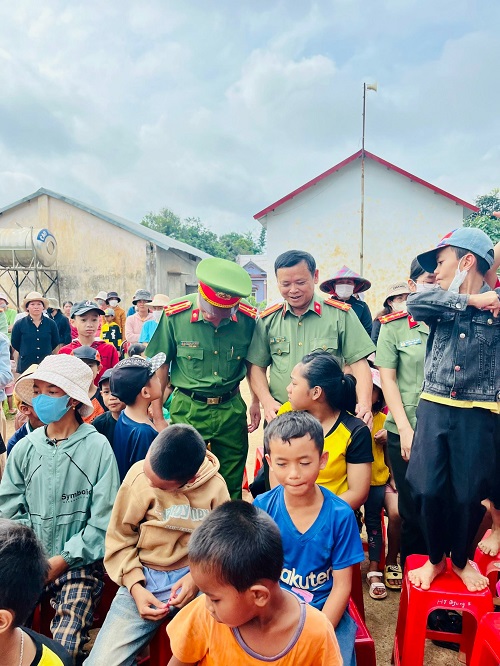 Đồng chí Thượng tá Nguyễn Cao Quyết, Trưởng Công an huyện ân cần thăm hỏi, động viên các em thiếu nhi
