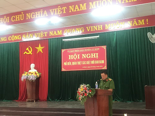 Sáng ngày 25/3/2021, Công an huyện Cư Kuin phối hợp các ngành chức năng của huyện tham mưu Ủy ban nhân dân huyện tổ chức Hội nghị phổ biến các luật mới ban hành. Đến dự Hội nghị có đồng chí Võ Tấn Huy, Chủ tịch Ủy ban nhân dân huyện, đại diện lãnh đạo các ban, ngành, đoàn thể của huyện, thành viên Hội đồng phối hợp phổ biến, giáo dục pháp luật của huyện, các Báo cáo viên pháp luật của huyện, đại diện chỉ huy các Đội nghiệp vụ Công an huyện, Trưởng Công an các xã và cán bộ Tư pháp - Hộ tịch của UBND các xã.