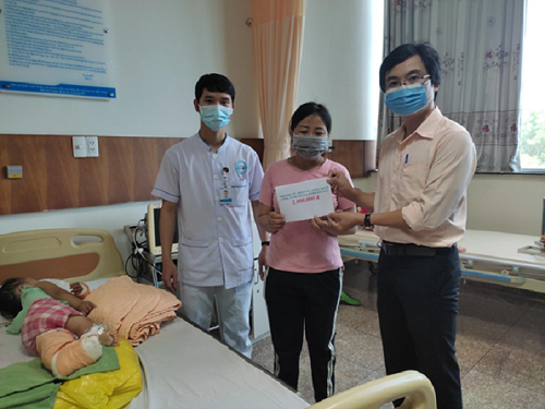 Đại diện Bệnh viện Hoàng Anh Gia Lai trao tặng 02 triệu đồng từ Công an huyện Ea H'leo hỗ trợ cho gia đình người dân gặp tai nạn trên đường về quê tránh dịch