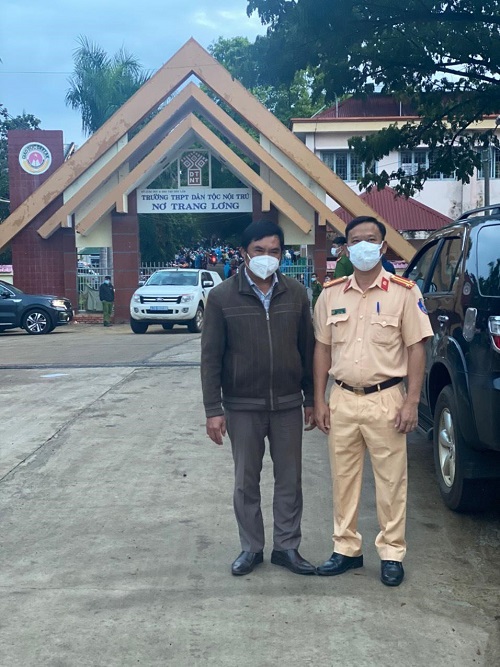 Đ/c Phan Hoàng Lâm - Phó Chủ tịch UBND huyện và đ/c Thiếu tá Nguyễn Văn Nam - Đội trưởng Đội CSGT - TT có mặt tại trường THPT Nơ Trang Lơng, TP Buôn Ma Thuột để đón công dân trở về huyện Krông Búk