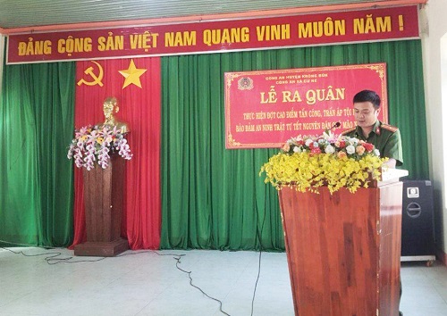 Đồng chí Trung tá Nguyễn Trần Tuấn - Ủy viên Ban thường vụ Huyện ủy, Bí thư Đảng ủy, Trưởng Công an huyện phát biểu chỉ đạo tại Lễ ra quân