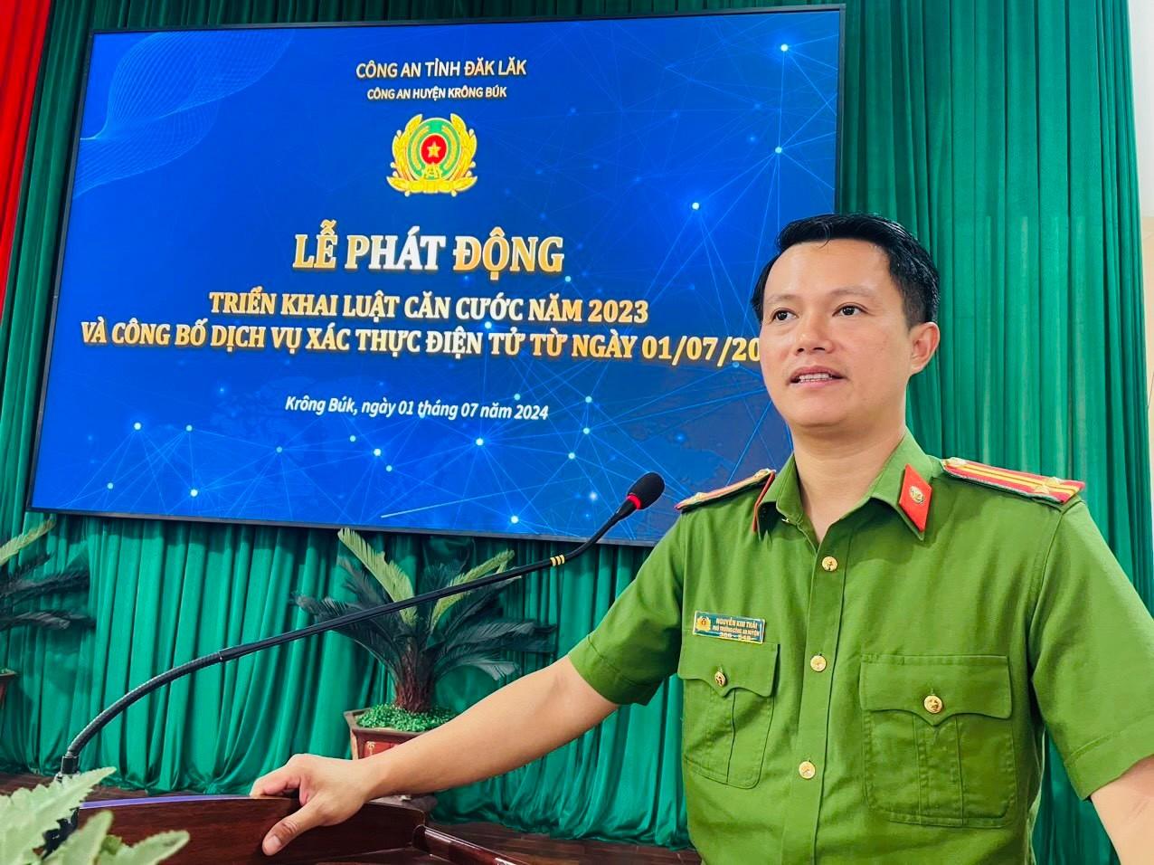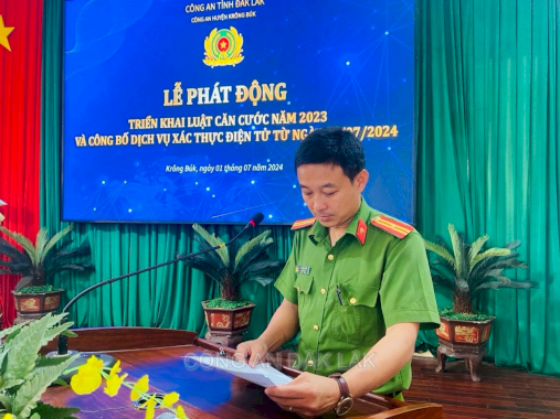 Ngày 01/7/2024, Công an huyện Krông Búk tổ chức Lễ phát động triển khai Luật Căn cước năm 2023 và thu nhận hồ sơ Căn cước, giấy chứng nhận Căn cước, đồng chí Thượng tá Nguyễn Trần Tuấn - Trưởng Công an huyện chủ trì lễ phát động; tham dự lễ có toàn thể CBCS Công an huyện, Công an các xã, thị trấn.