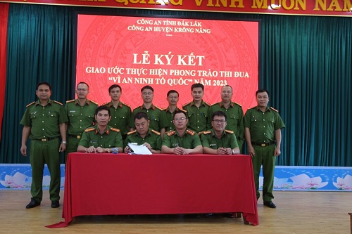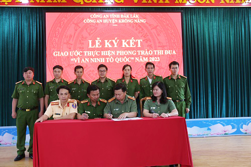 Cùng ngày, Công an huyện tổ chức Lễ ký kết giao ước thực hiện phong trào thi đua "Vì an ninh Tổ quốc" năm 2023, quyết tâm thực hiện thắng lợi các chỉ tiêu đề ra, hoàn thành xuất sắc nhiệm vụ chính trị năm 2023. Qua đó, Công an huyện chia làm 02 cụm thi đua: Cụm thi đua số 1: Gồm các đội nghiệp vụ do Đội Tổng hợp làm Cụm trưởng; Cụm thi đua số 2: Gồm 12 đơn vị Công an xã, thị trấn do Công an thị trấn làm Cụm trưởng.