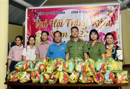Hoà chung không khí vui Tết Trung thu trên khắp cả nước, tối ngày 08/9/2022, Công an huyện M'Đrắk phối hợp Công ty TNHH MTV Cà phê 715A tổ chức chương trình "Vui hội trăng rằm" cho các em thiếu nhi tại Buôn kết nghĩa - Buôn Cưăh Ea Hmlai, xã Krông Jing.