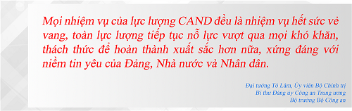 Trước những yêu cầu mới, nhiệm vụ mới, với những khó khăn, thách thức ngày càng lớn hơn, toàn lực lượng CAND tiếp tục giữ vững, phát huy và bồi đắp truyền thống anh hùng vẻ vang mà các thế hệ cán bộ, chiến sĩ đã dày công vun đắp; không ngừng đổi mới tư duy, tầm nhìn, quyết tâm chính trị cao, hành động quyết liệt để thực hiện ngày càng tốt hơn, hiệu quả hơn nhiệm vụ bảo vệ ANTT, bảo vệ Đảng, Nhà nước và nhân dân. Tập trung làm tốt công tác nắm, dự báo tình hình, tham mưu chiến lược và chiến thuật, kiên quyết đấu tranh không khoan nhượng với các thế lực thù địch, tội phạm, bảo vệ vững chắc an ninh quốc gia, đảm bảo trật tự an toàn xã hội, đẩy lùi tội phạm, phấn đấu đạt mục tiêu giảm tội phạm bền vững. Tiếp tục thực hiện đồng bộ các giải pháp phòng ngừa tội phạm, kết hợp với đẩy mạnh tấn công trấn áp tội phạm, đồng thời nâng cao hiệu lực, hiệu quả quản lý Nhà nước, hoàn thiện thể chế, chính sách pháp luật; gắn bó chặt chẽ với nhân dân, phối hợp hiệp đồng hiệu quả với Quân đội nhân dân, các cấp, các ngành; tăng cường hợp tác quốc tế nhằm ngăn chặn tội phạm từ sớm, từ xa, từ cơ sở, các nguy cơ tác động tiêu cực đến an ninh quốc gia, trật tự an toàn xã hội.