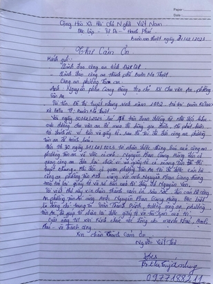 Chị Đỗ Thị Tuyết Nhung (người đánh rơi tài sản) gửi thư cảm ơn Công an phường Tân An