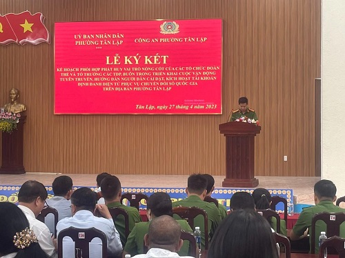 Công an phường Tân Lập tham mưu Ủy ban nhân dân phường Tân Lập phối hợp cùng các tổ chức đoàn thể; tổ trưởng các tổ dân phố, buôn; đội quản lý hành chính về TTXH Công an thành phố Buôn Ma Thuột tổ chức "Lễ ký kết kế hoạch phối hợp phát huy vai trò nòng cốt của các tổ chức đoàn thể và tổ trưởng các tổ dân phố, Buôn trong triển khai cuộc vận động tuyên truyền, hướng dẫn người dân cài đặt, kích hoạt tài khoản định danh điện tử phục vụ chuyển đổi số trên địa bàn phường Tân Lập".