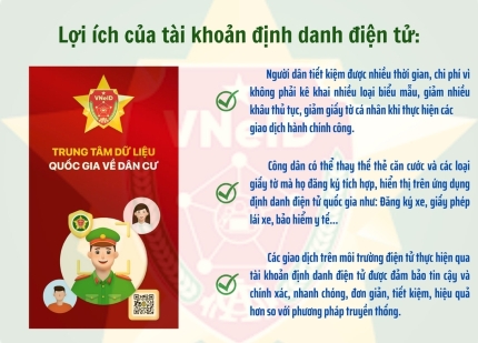 Định danh điện tử “chìa khoá” kết nối dữ liệu điện tử, mang lại nhiều lợi ích cho người dân, doanh nghiệp và tạo thuận tiện trong công tác quản lý Nhà nước.Việc sử dụng tài khoản định danh điện tử (VneID) được xem là giải pháp nhằm tiết kiệm thời gian, chi phí, giúp thay thế nhiều loại giấy tờ và giúp tổ chức, cá nhân giảm nhiều khâu thủ tục khi thực hiện các giao dịch hành chính công mà không cần phải trực tiếp đến các cơ quan hành chính để giải quyết. Chính vì vậy, thời gian tới, bên cạnh sự cố gắng, nố lực của lực lượng chức năng, rất cần có sự chung tay của mỗi người dân để hoàn thành mục tiêu đề ra nhằm phục vụ nhu cầu, lợi ích thiết thực của cá nhân cũng như từng bước đưa định danh điện tử đi vào cuộc sống./.