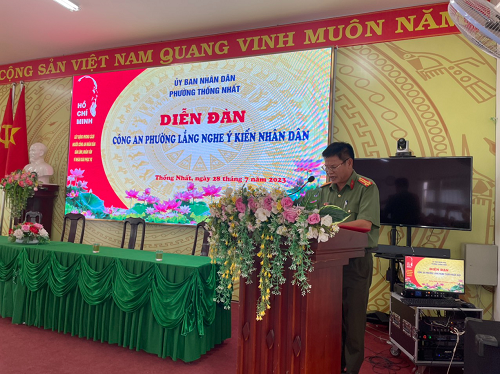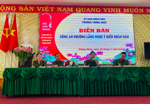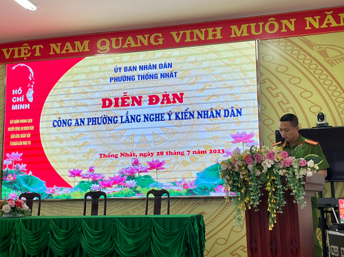 Sáng ngày 28/7/2023, Công an phường phường Thống Nhất đã tổ chức Diễn đàn “Công an phường lắng nghe ý kiến Nhân dân” năm 2023 với chủ đề “Xây dựng Công an phường điển hình, kiểu mẫu về an ninh, trật tự và văn minh đô thị” để lắng nghe ý kiến đóng góp của quần chúng nhân dân về tư thế, lễ tiết tác phong; ý thức trách nhiệm, tinh thần phục vụ nhân dân của cán bộ chiến sỹ Công an phường, qua đó cũng cố niềm tin, tạo khí thế thi đua, sôi nổi trong các tầng lớp nhân dân nhằm đưa phong trào toàn dân bảo vệ an ninh Tổ quốc phát triển sâu rộng, vững chắc với chất lượng và hiệu quả cao, đáp ứng yêu cầu nhiệm vụ trong tình hình mới. Qua đó, khẳng định vị trí, tầm quan trọng của Nhân dân, cùng tham gia phối hợp giúp đỡ lực lượng Công an trong sự nghiệp bảo vệ an ninh quốc gia, giữ gìn TTATXH; Nêu cao tinh thần trách nhiệm và tâm huyết phục vụ Nhân dân; thái độ lắng nghe ý kiến Nhân dân của lực lượng Công an.