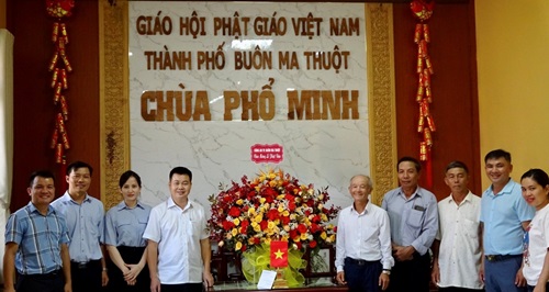 Đoàn do đồng chí Thượng tá Lê Văn Mạnh - Phó Trưởng Công an thành phố làm trưởng đoàn đã tới thăm và chúc mừng Ban Trị sự Giáo hội Phật giáo Việt Nam tỉnh Đắk Lắk, Ban Trị sự Giáo hội Phật giáo Việt Nam thành phố Buôn Ma Thuột, các tăng ni, phật tử của chùa Khải Đoan, chùa Phổ Minh, tịnh xá Ngọc Quang. Cùng đi có đồng chí Trung tá Nguyễn Sỹ Thực – Đội trưởng Đội An ninh, đồng chí Thiếu tá Nguyễn Trần Kim Anh – Phó Đội trưởng Đội An ninh và các cán bộ Công an phụ trách địa bàn.