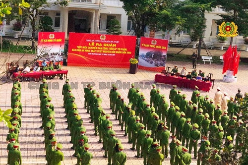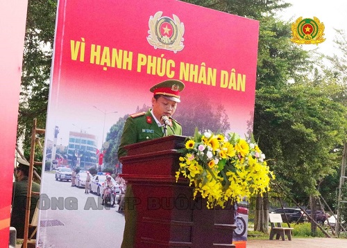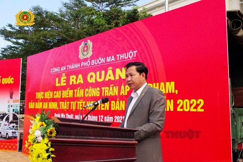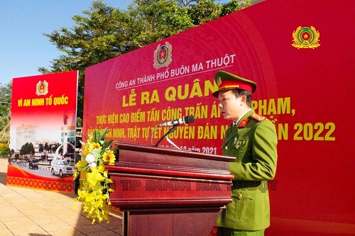 Thực hiện chỉ đạo của lãnh đạo Công an tỉnh, tại buổi lễ đồng chí Thượng tá Bùi Trọng Tuấn – Trưởng Công an thành phố Buôn Ma Thuột đã phát lệnh toàn lực lượng Công an thành phố đồng loạt ra quân tấn công trấn áp tội phạm, bảo đảm an ninh, trật tự, an toàn giao thông, phòng, chống cháy nổ trước, trong và sau dịp Tết Nguyên đán Nhâm Dần 2022.