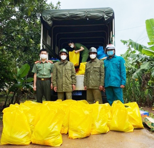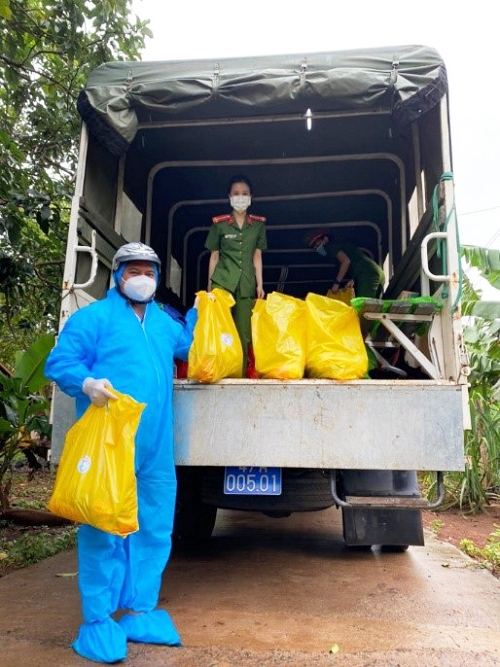 Đoàn công tác của Công an TX Buôn Hồ vận chuyển các nhu yếu phẩm đến hỗ trợ người dân