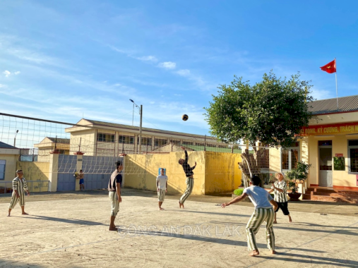 Hình ảnh phạm nhân chơi bóng chuyền sau giờ lao động