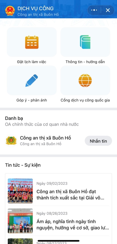Triển khai Zalo Mini App trong đơn vị, với những tính năng cụ thể như: Xây dựng nội dung trả lời các câu hỏi thường gặp trong phần thông tin – hướng dẫn để hướng dẫn, giải đáp các thắc mắc của người dân một cách nhanh chóng, đơn giản; Người dân có thể bốc số thứ tự giải quyết thủ tục hành chính tại nhà hoặc tại cơ quan Công an thông qua hình thức quét mã QR liên kết vào App được niêm yết tại trụ sở và theo dõi số thứ tự hiện tại đang được giải quyết thủ tục hành chính thông qua điện thoại của mình, qua đó góp phần chủ động, tiết kiệm được thời gian ngồi đợi cho người dân; Tiếp nhận và trả lời góp ý, phản ánh kiến nghị của người dân thông qua App, nhằm giải quyết nhanh chóng những khó khăn vướng mắc, tồn tại hạn chế một cách công khai minh bạch cho người dân; Liên kết với đường link Cổng dịch vụ công trực tuyến và Trang Zalo OA của Công an thị xã, hỗ trợ người dân dễ dàng tiếp cận để thao tác đăng ký thủ tục hành chính trực tuyến và tiếp cận thông tin, tin tức trên trang Zalo OA của đơn vị.