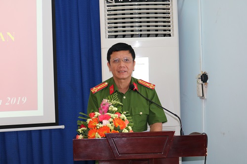 Đồng chí Thượng tá Vũ Tiến Thăng – Bí thư Đảng ủy, Trưởng Công an thị xã phát biểu tại Hội nghị