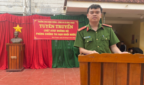 Đồng chí Trung úy Hà Huy Duy - Cán bộ Đội CS PCCC và CNCH tuyên truyền cách phòng, chống tai nạn đuối nước