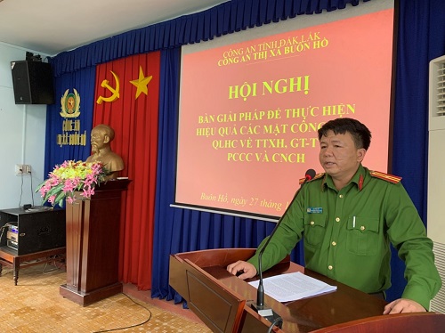 Phát biểu chỉ đạo tại Hội nghị, Đồng chí Thiếu tá Lê Đình Đô – Phó Trưởng Công an thị xã Buôn Hồ đã biểu dương, khen ngợi các thành tích của lực lượng Công an thị xã trong thời gian qua. Đồng thời, đồng chí chỉ đạo một số công tác trọng tâm trong thời gian tới nhằm tiếp tục phát huy những kết quả đã đạt được, triển khai các giải pháp đã đưa ra, quyết tâm khắc phục những tồn tại, hạn chế để thực hiện xuất sắc, hiệu quả các mặt công tác của đơn vị nói chung và công tác quản lý hành chính, giao thông và phòng cháy chữa cháy nói riêng.