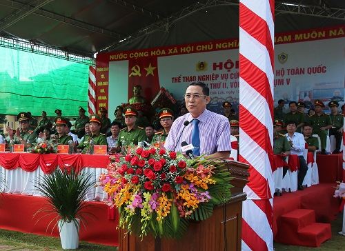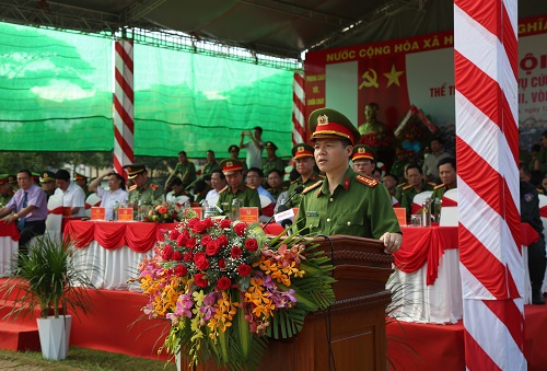 Đồng chí Thiếu tướng Lê Vinh Quy – Giám đốc Công an tỉnh, Trưởng Ban tổ chức Hội thi phát biểu khai mạc