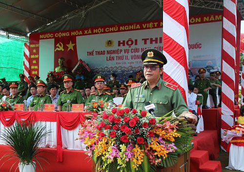 Đồng chí Đại tá Nguyễn Minh Khương – Phó Cục trưởng Cục phòng cháy, chữa cháy và cứu nạn, cứu hộ phát biểu tại Hội thi