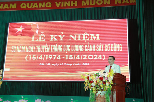 Tại buổi lễ, các đại biểu đã cùng nhau ôn lại truyền thống 50 năm xây dựng, chiến đấu, trưởng thành của lực lượng Cảnh sát cơ động cả nước nói chung và Cảnh sát cơ động Công an Đắk Lắk nói riêng. Dưới sự chỉ đạo của Đảng, Chính phủ, Bộ Công an, Tỉnh ủy, UBND tỉnh Đắk Lắk và lãnh đạo Công an tỉnh qua các thời kỳ, lực lượng Cảnh sát cơ động đã vượt qua những khó khăn, thử thách; vừa tham gia bảo vệ an toàn tuyệt đối những mục tiêu trọng yếu, các đoàn lãnh đạo Đảng, Nhà nước, khách quốc tế đến thăm, làm việc trên địa bàn tỉnh, những chuyến hàng đặc biệt, các hoạt động, sự kiện chính trị, kinh tế, văn hóa, xã hội quan trọng diễn ra trên địa bàn tỉnh; vừa phối hợp với các lực lượng chức năng đấu tranh trấn áp các tổ chức, đảng phái phản động và tham gia hàng trăm đợt truy quét FULRO vũ trang có nhiều nợ máu với Nhân dân. Qua đó, đã cùng toàn quân bắt, xử lý, vô hiệu hóa các đối tượng, thu hàng ngàn hung khí, súng, đạn các loại, tang vật, tài liệu, phương tiện vi phạm liên quan, góp sức chặn đứng các đợt gây rối, biểu tình, bạo loạn, phá hoại, gây khủng bố của bọn phản động FULRO, góp sức đảm bảo ổn định an ninh chính trị trên địa bàn tỉnh.