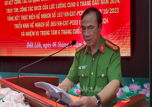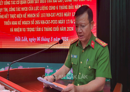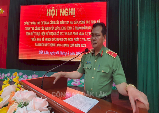 Sáng ngày 06/8/2024, Công an tỉnh Đắk Lắk tổ chức Hội nghị sơ kết công tác Cơ quan Cảnh sát điều tra hai cấp; công tác truy nã, truy tìm, công tác NVCB của lực lượng CSND 6 tháng đầu năm 2024; tổng kết kết quả thực hiện Kế hoạch số 187/KH-CAT-PC03 ngày 12/10/2023, triển khai Kế hoạch số 265/KH-CAT-PC03 ngày 17/6/2024 về tăng cường công tác phòng ngừa, đấu tranh với tội phạm, vi phạm pháp luật trong lĩnh vực khoáng sản trên địa bàn tỉnh Đắk Lắk và nhiệm vụ trọng tâm 6 tháng cuối năm 2024.