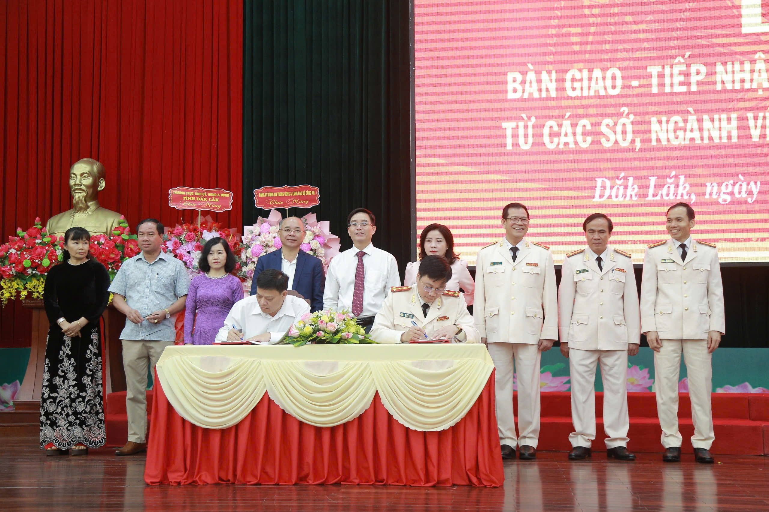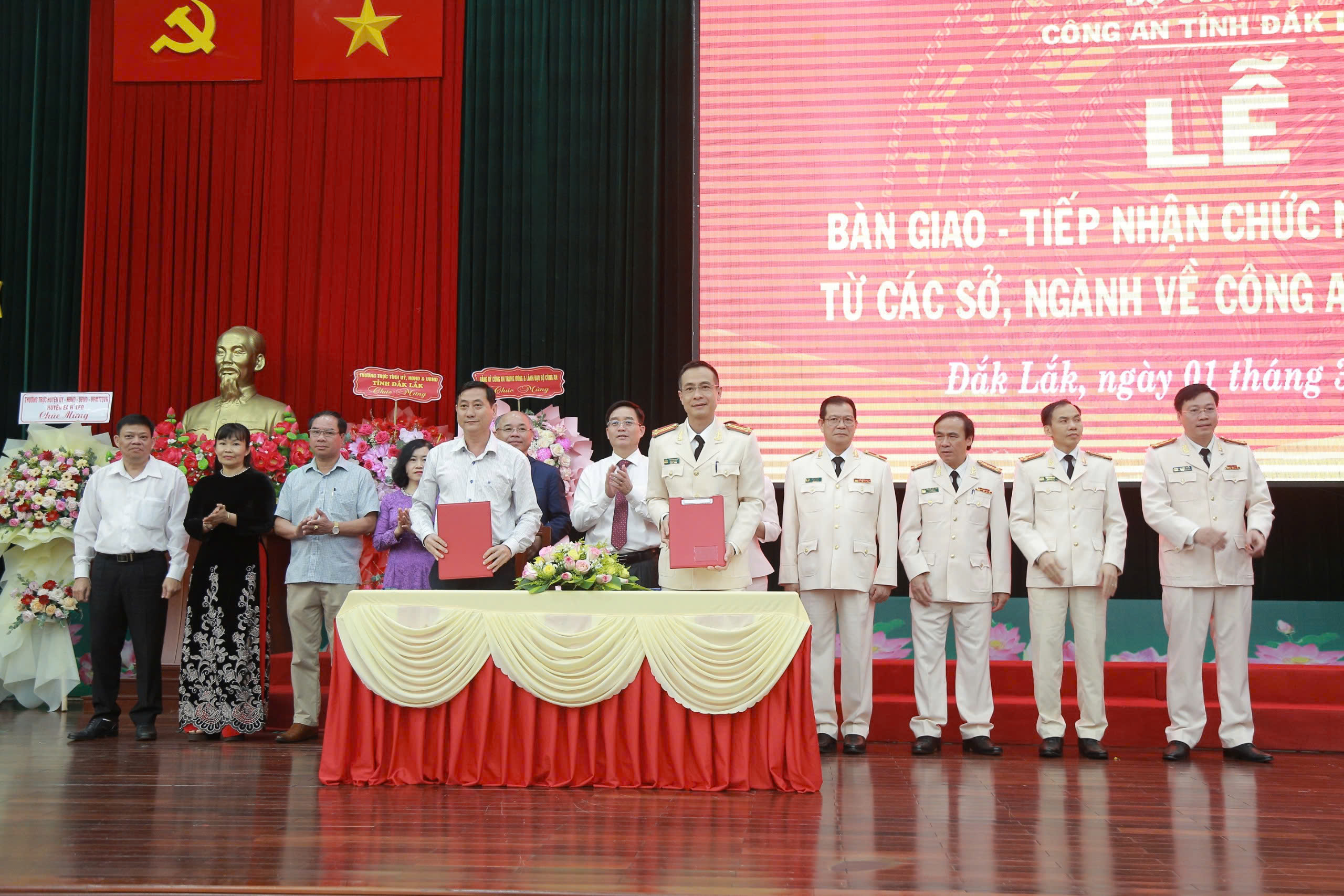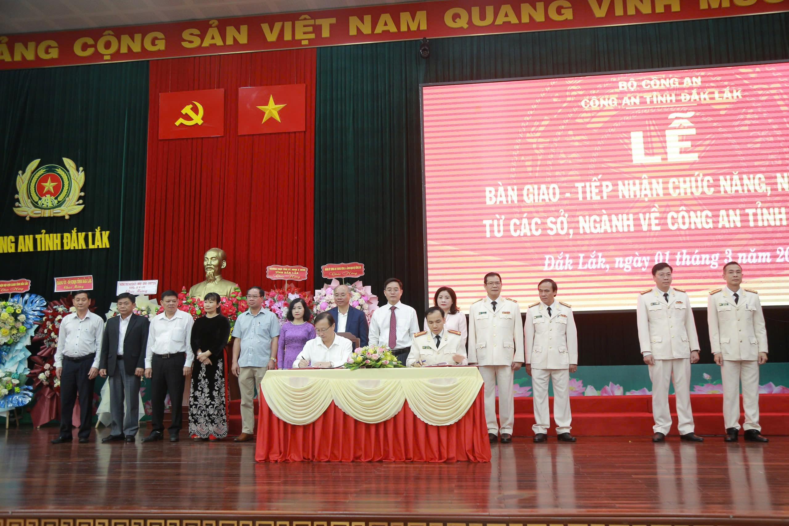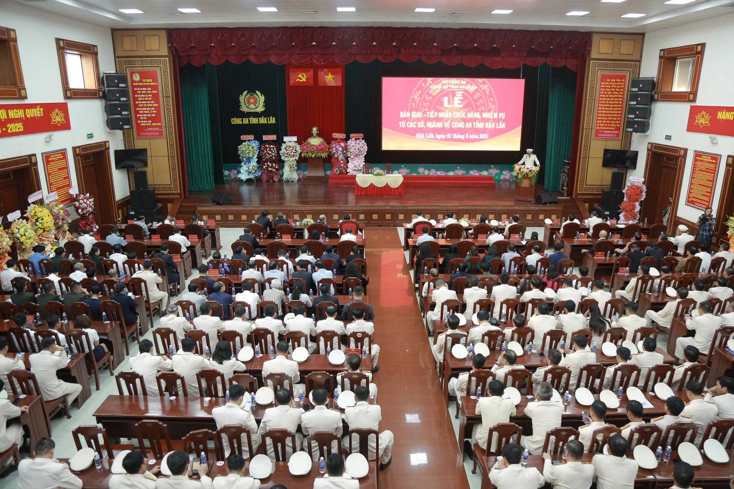 Theo đó, sáng ngày 01/3/2025, Công an tỉnh đã chủ trì, phối hợp với các đơn vị, sở, ngành có liên quan tổ chức Lễ bàn giao - tiếp nhận 05 chức năng, nhiệm vụ quản lý nhà nước từ các đơn vị, sở, ngành về Công an tỉnh và ra mắt tổ chức bộ máy mới của Công an tỉnh Đắk Lắk (chính thức đi vào hoạt động từ ngày 01/3/2025).