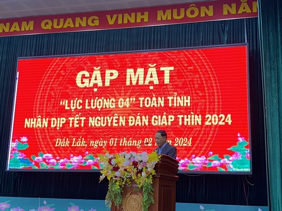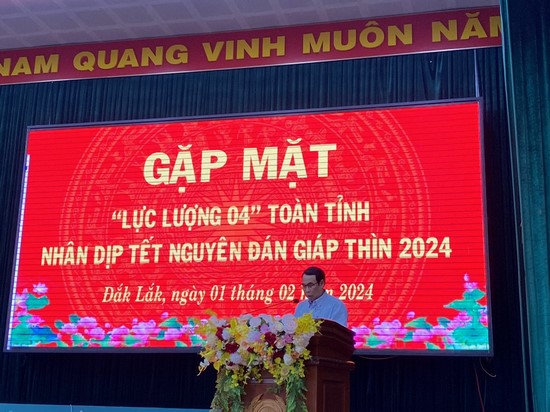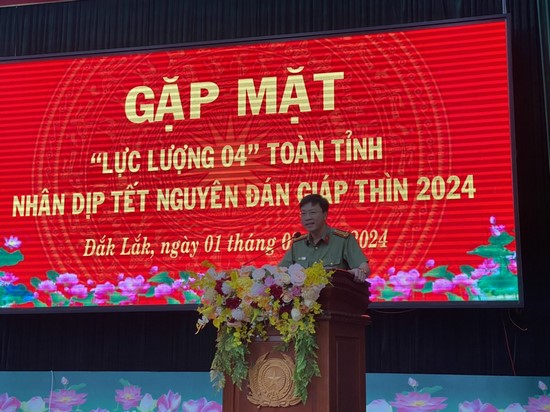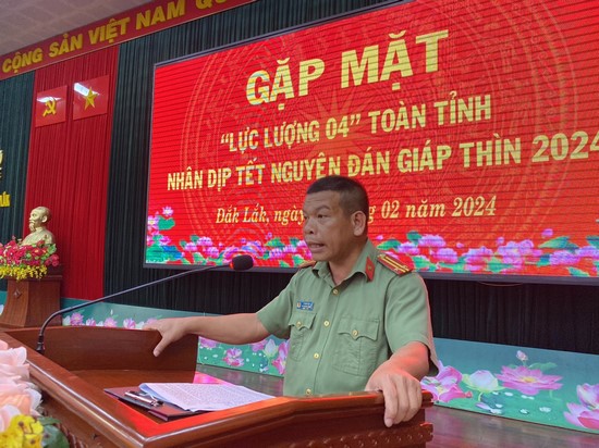 Tại buổi gặp mặt, Đồng chí Trung tá Y Lương Niê - Phó Trưởng phòng An ninh đối nội, Công an tỉnh đã thông báo cho Lực lượng 04 tình hình, kết quả công tác bảo đảm an ninh, trật tự trên địa bàn tỉnh năm 2023 và âm mưu, hoạt động chống phá của các thế lực thù địch, phản động, hoạt động của các loại tội phạm dịp Tết Nguyên đán Giáp Thìn 2024 để Lực lượng 04 biết, nâng cao cảnh giác, cùng phối hợp với lực lượng Công an tỉnh trong công tác bảo đảm an ninh, trật tự thời gian tới.