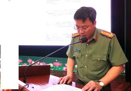 Đồng chí Đại tá Nguyễn Văn Bôn - Phó Giám đốc Công an tỉnh điều hành nội dung báo cáo chuyên đề và phát biểu tham luận tại Hội nghị